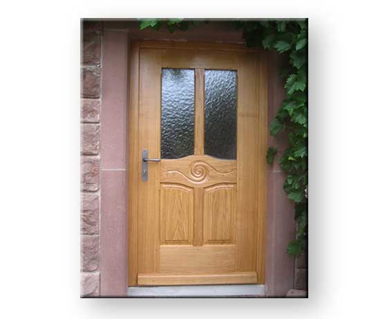 Hauseingangstüre in Eichenholz mit Spiralrelief und Sicherheitsglas
